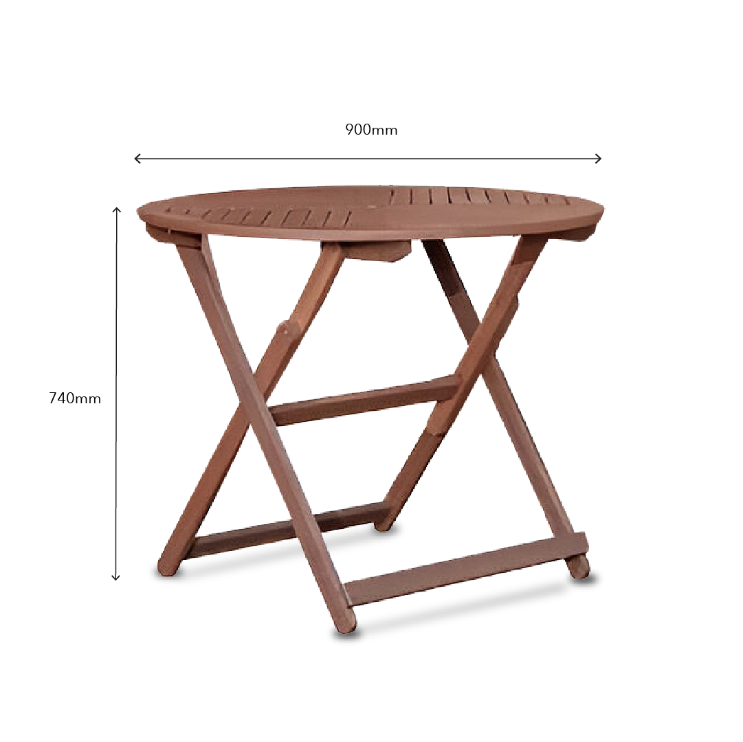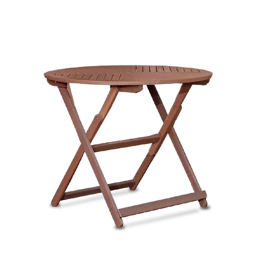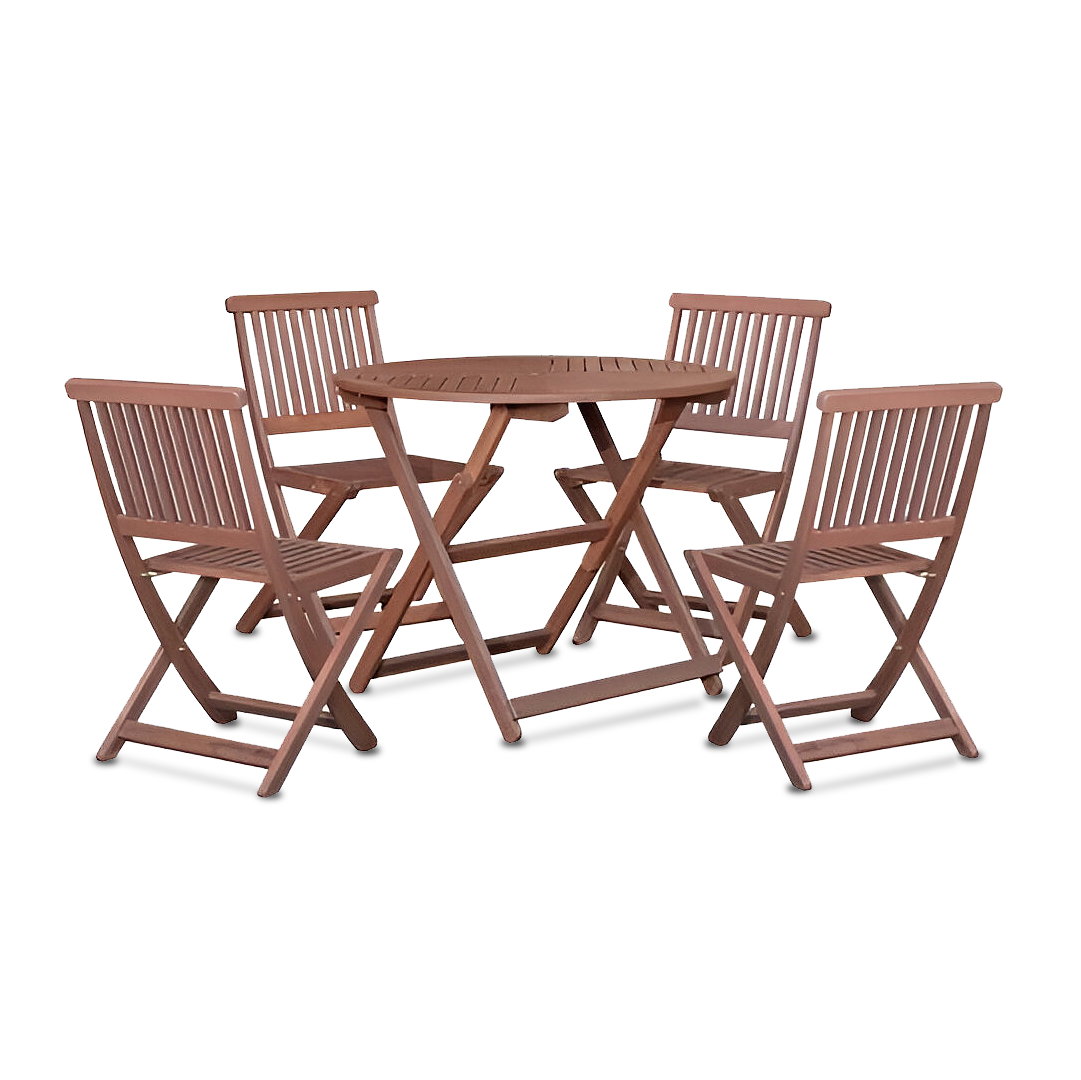 The Eden II Round Table Set with Folding Chair is a durable and stylish outdoor furniture set made from full rainforest wood in a Mahogany color. The set includes a round foldable table and four folding garden chairs, providing convenience for storage and transport. Designed to endure exposure to sunlight and rain, this set is ideal for outdoor gatherings or picnics. It combines durability, functionality, and elegance, making it a practical and attractive addition to outdoor spaces.