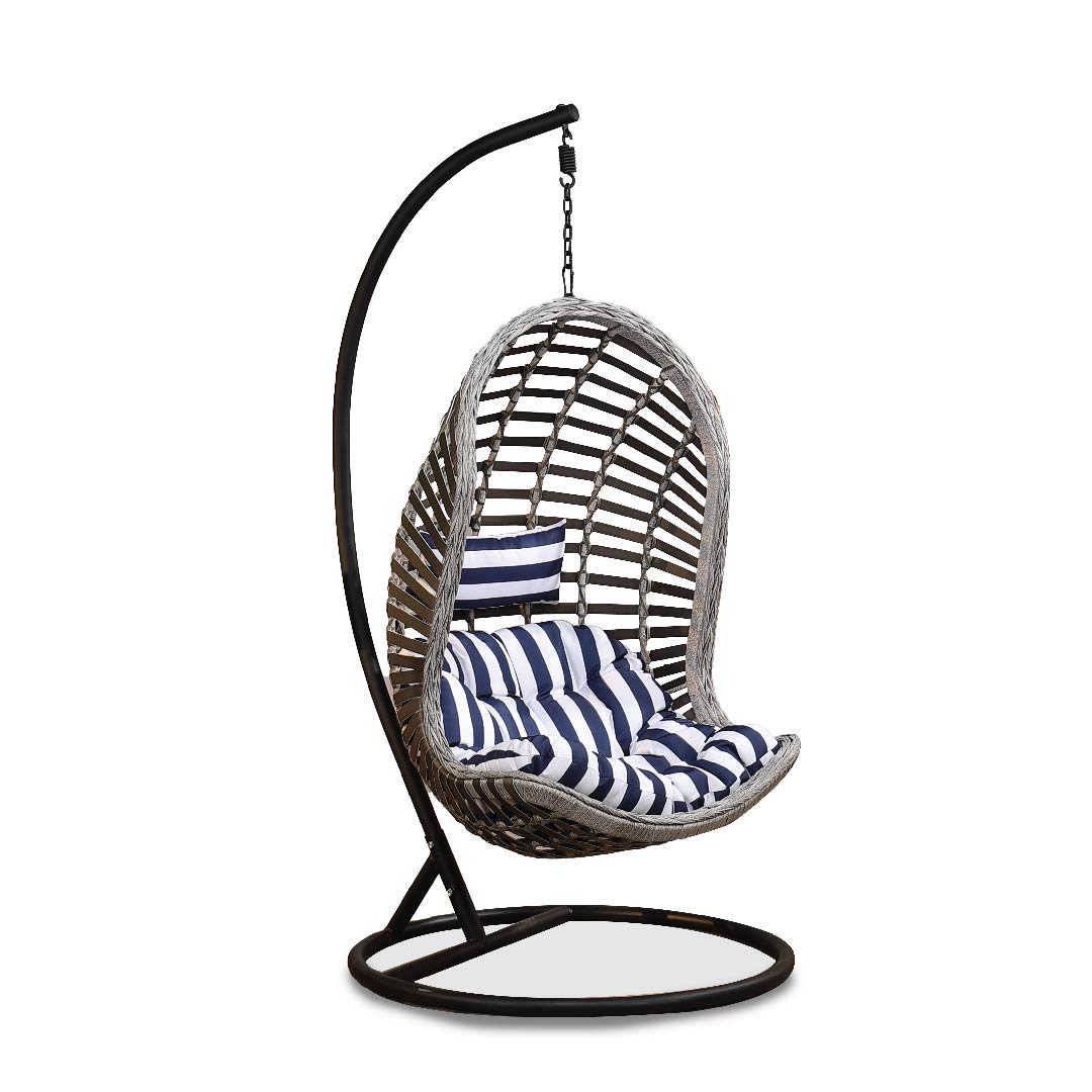The Vilnius Swing features a durable plastic frame, powder-coated steel legs, and comfortable polyester fabric seating, complete with cushions. Designed for indoor use only, it provides both style and comfort for your living space.
