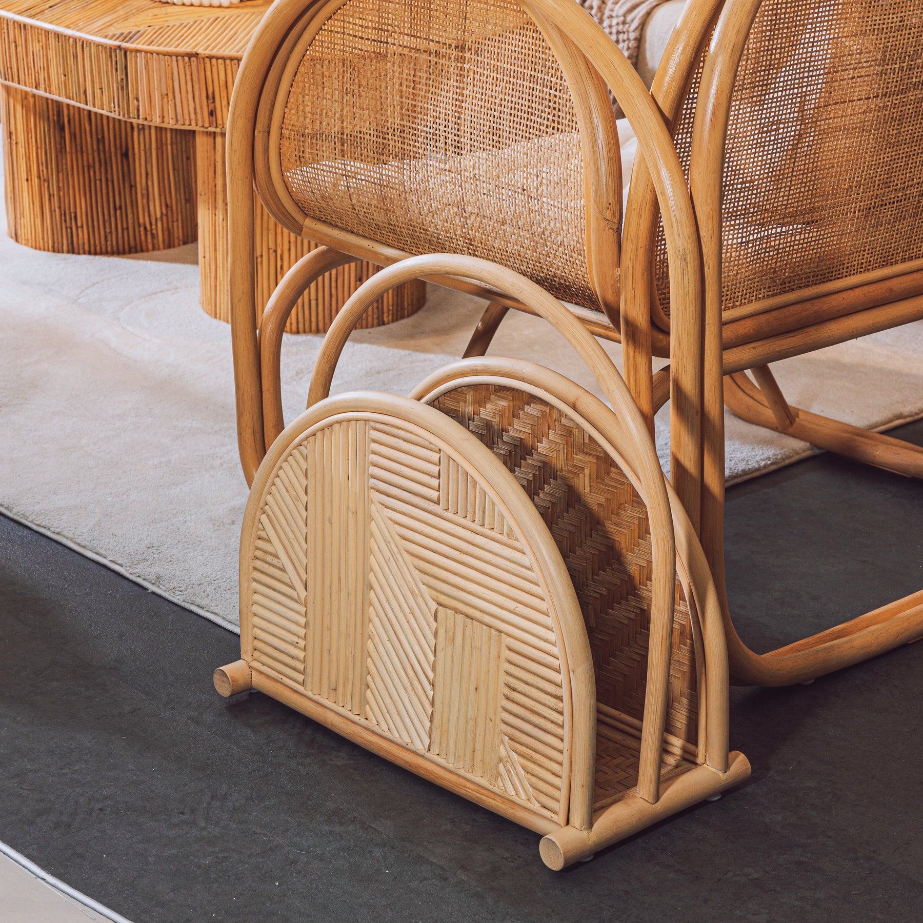 The Aurora Magazine Holder is a stylish and functional piece of furniture designed to keep your magazines and periodicals neatly organized while adding a touch of natural elegance to your living space. Crafted with precision and an appreciation for both form and function, this magazine holder features a harmonious blend of materials, including plywood, bamboo webbing, teak wood, and natural rattan.