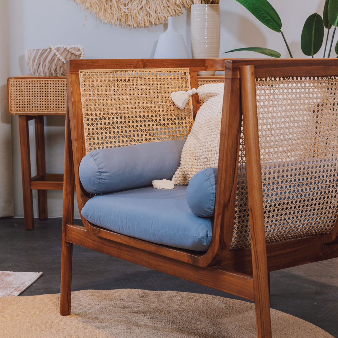 The Mameha Lounge Chair it's a statement of craftsmanship and design. With its careful selection of materials, including Mahogany Wood, Teak Wood, and Tanjung Webbing Rattan, and its two stunning color options, it offers a comfortable and stylish seating experience that enhances the ambiance of your living space or outdoor area.