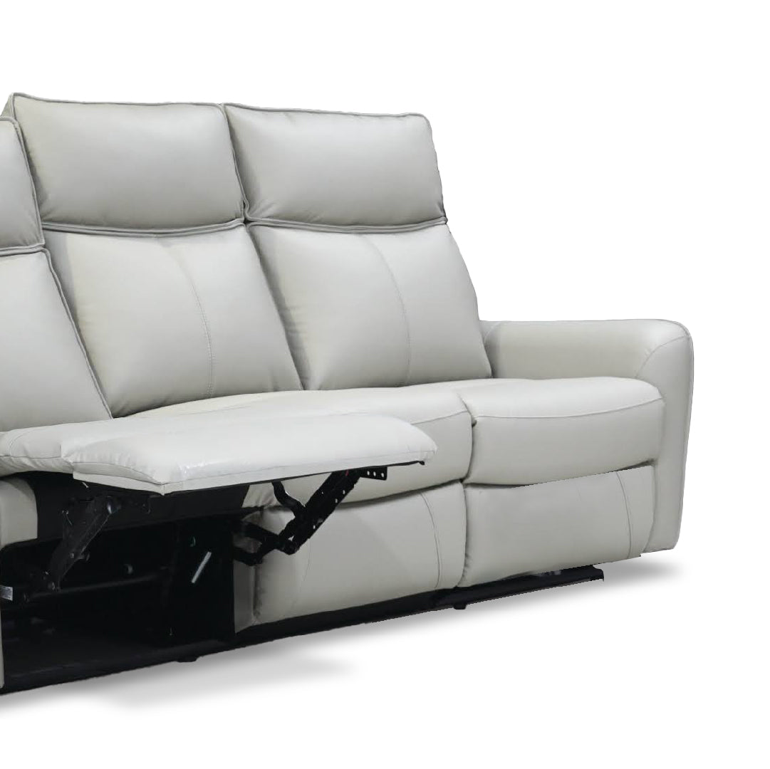 The Lior Recliner Sofa Set, available in configurations like 3+2+1, 2+3, and 1+3 seater, combines comfort and style with high-density foam seats, high resilience foam backrests, and a durable plywood/Meranti wood frame. Finished in light grey and featuring this set offers flexible relaxation with a sleek, modern design.
