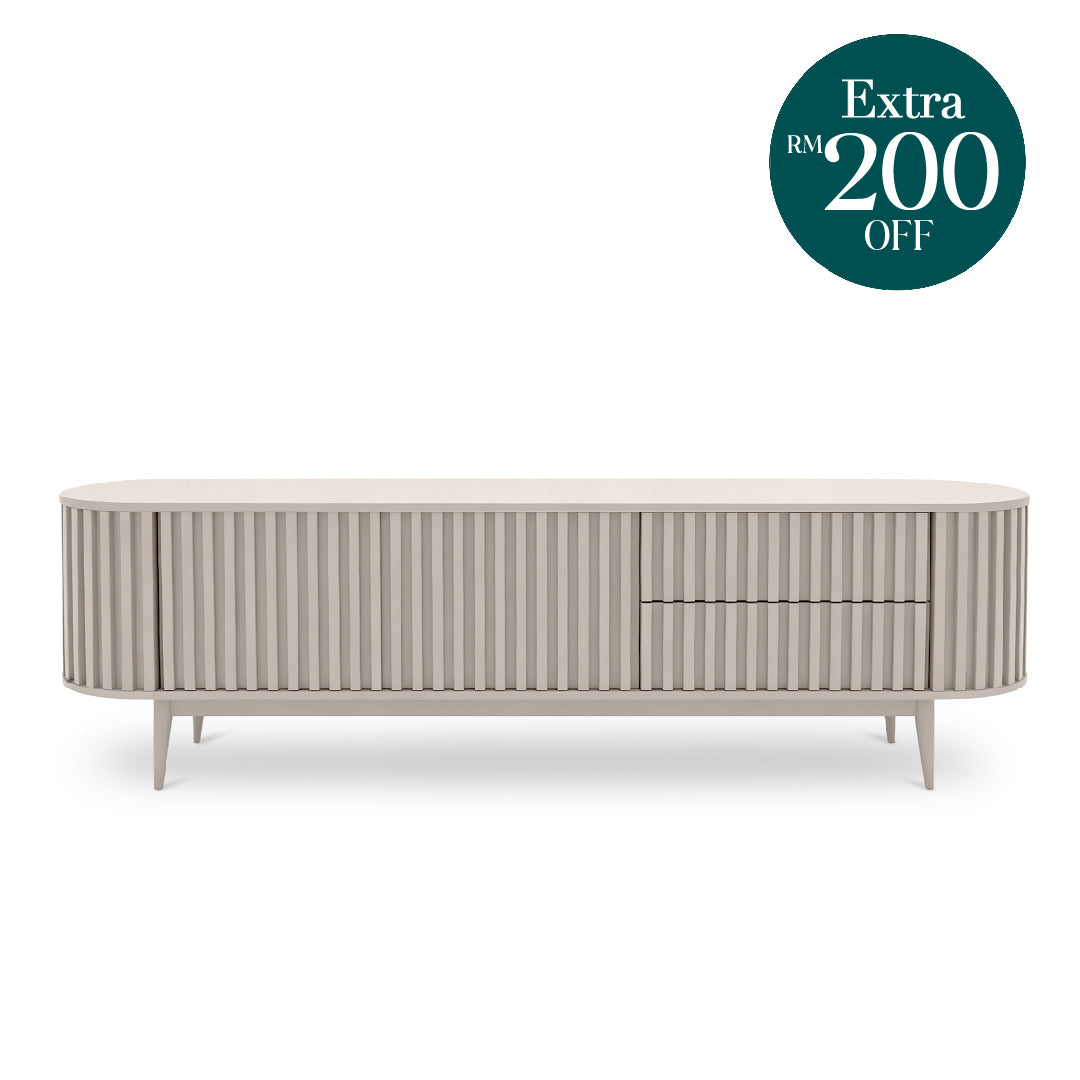 Meije TV Cabinet features a modern fluted design in an elegant dark gray finish. Crafted with durable MDF for the top and bottom, and supported by solid rubberwood legs, it offers both style and stability. Designed for practicality, it includes 2 drawers and 2 open door storage compartments, providing ample space to organize media essentials while enhancing your living area.