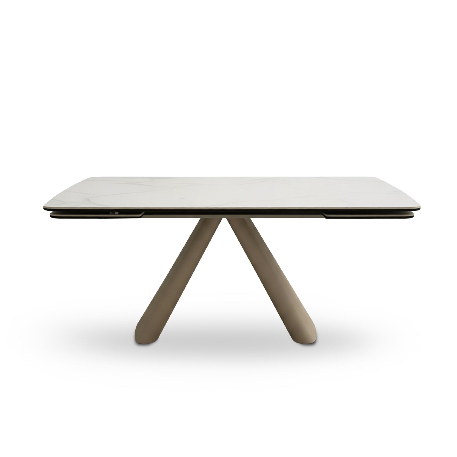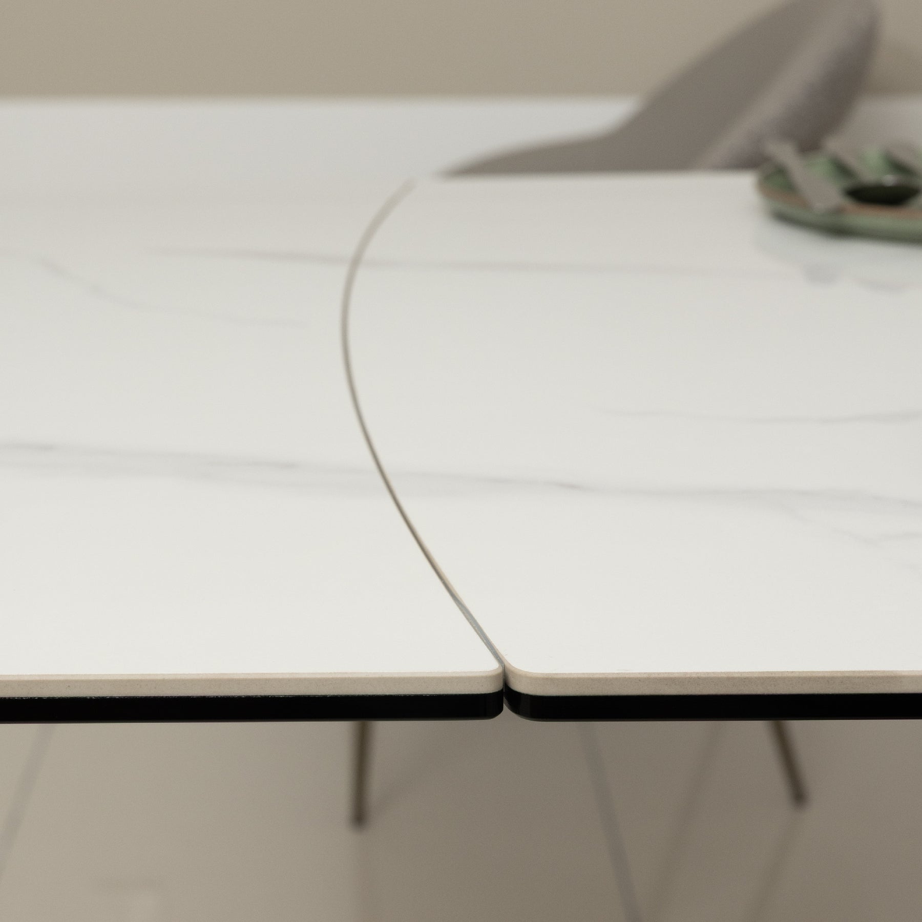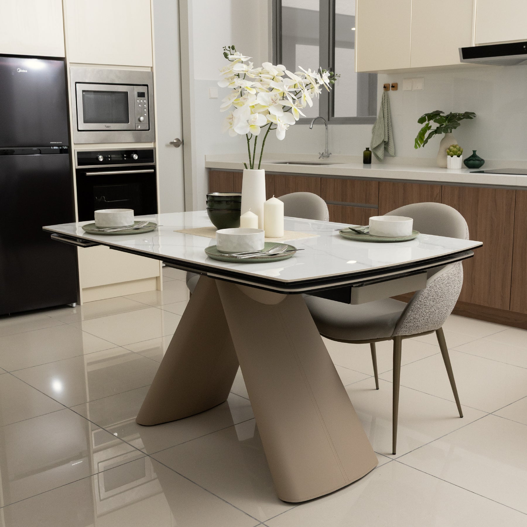 Snow Mountain Extendable Dining Table – Sleek ceramic top with tempered glass paired with a sturdy metal base. Features a versatile extendable design, comfortably seating up to 6, perfect for modern dining spaces.