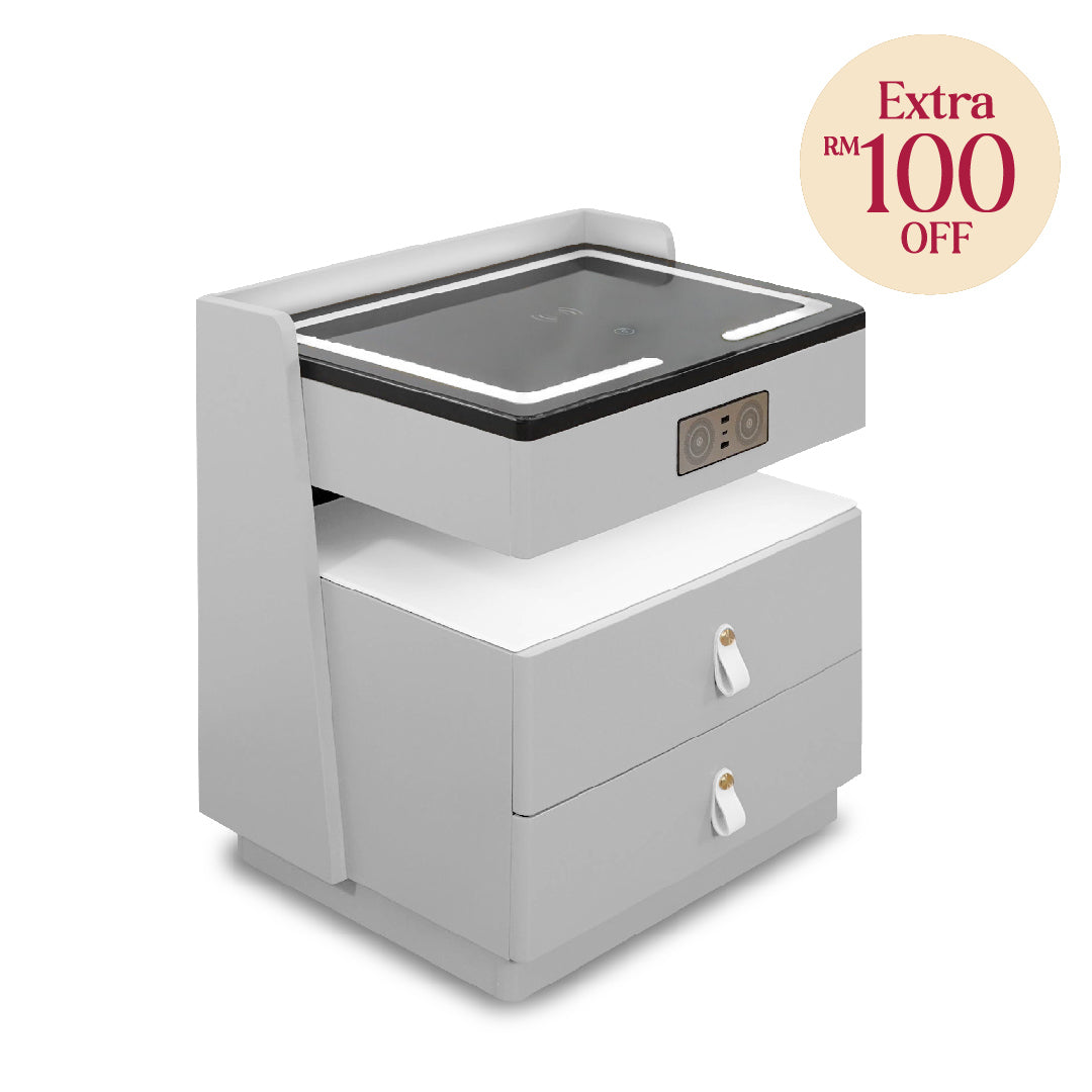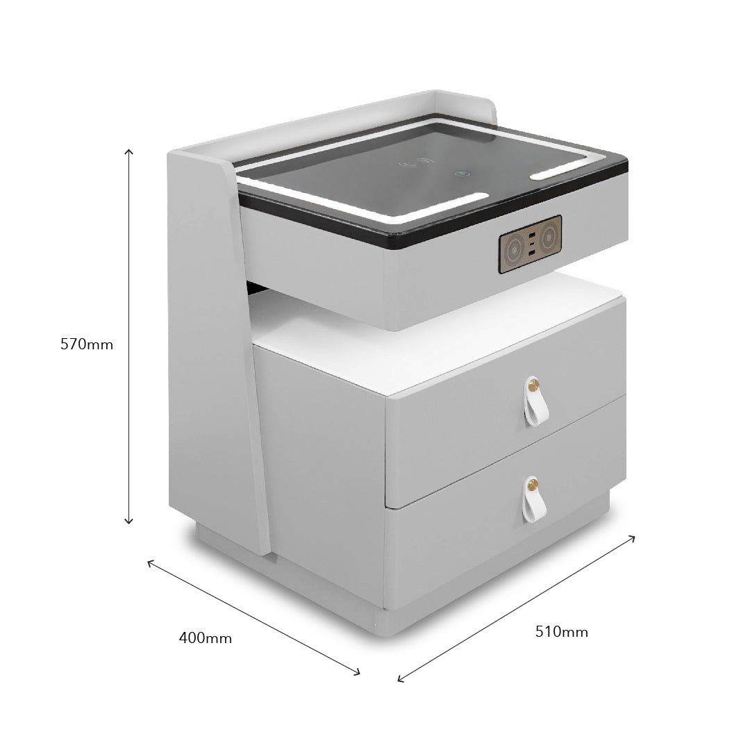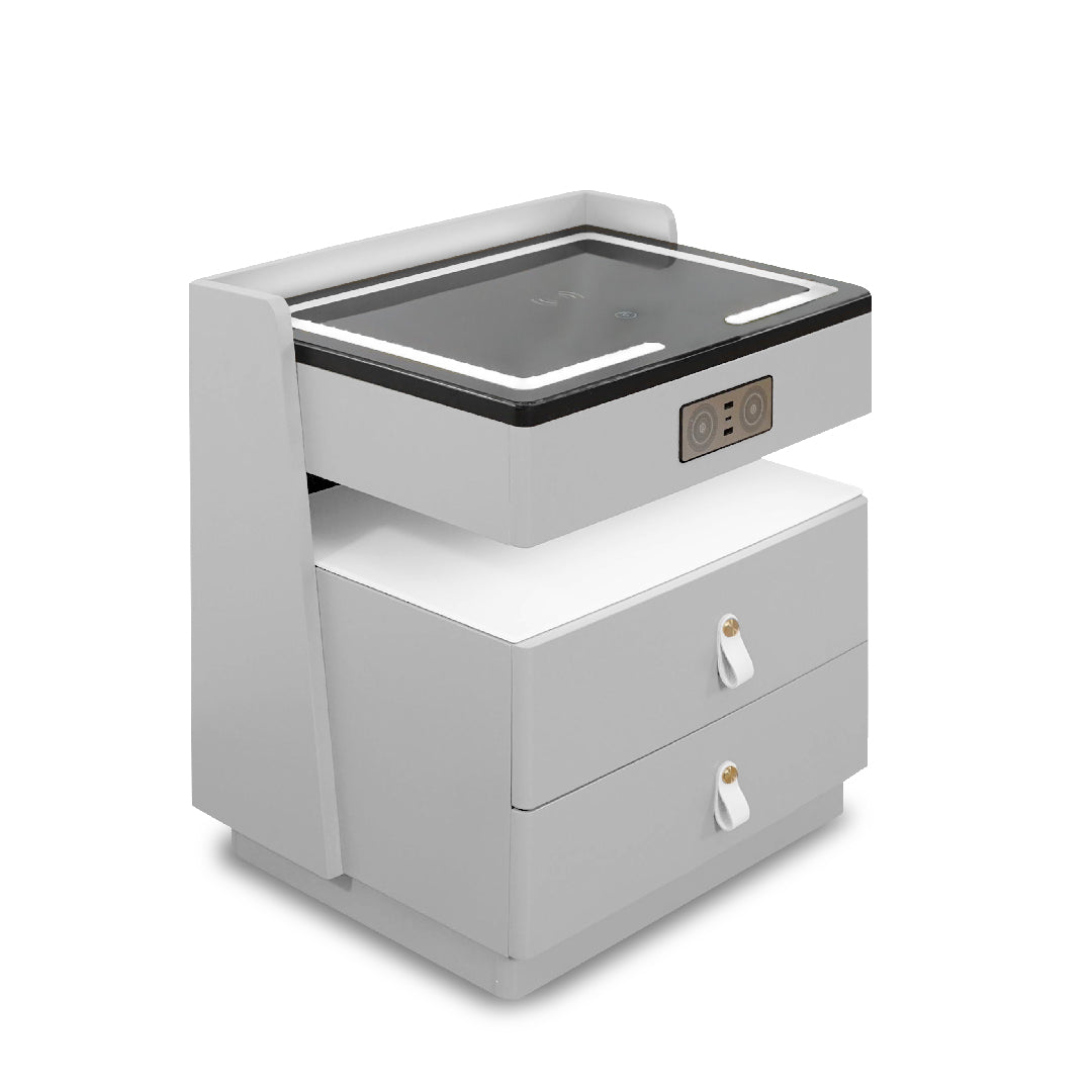 Jorah Side Table is A modern and versatile piece featuring a tinted glass top and a durable MDF and solid rubberwood frame with a sleek spray-painted finish. Equipped with smart technology, it includes a wireless charging tabletop, built-in Bluetooth speaker, and 3 USB ports (2 USB-A, 1 USB-C). With two spacious drawers, it seamlessly combines functionality and style for any living space.