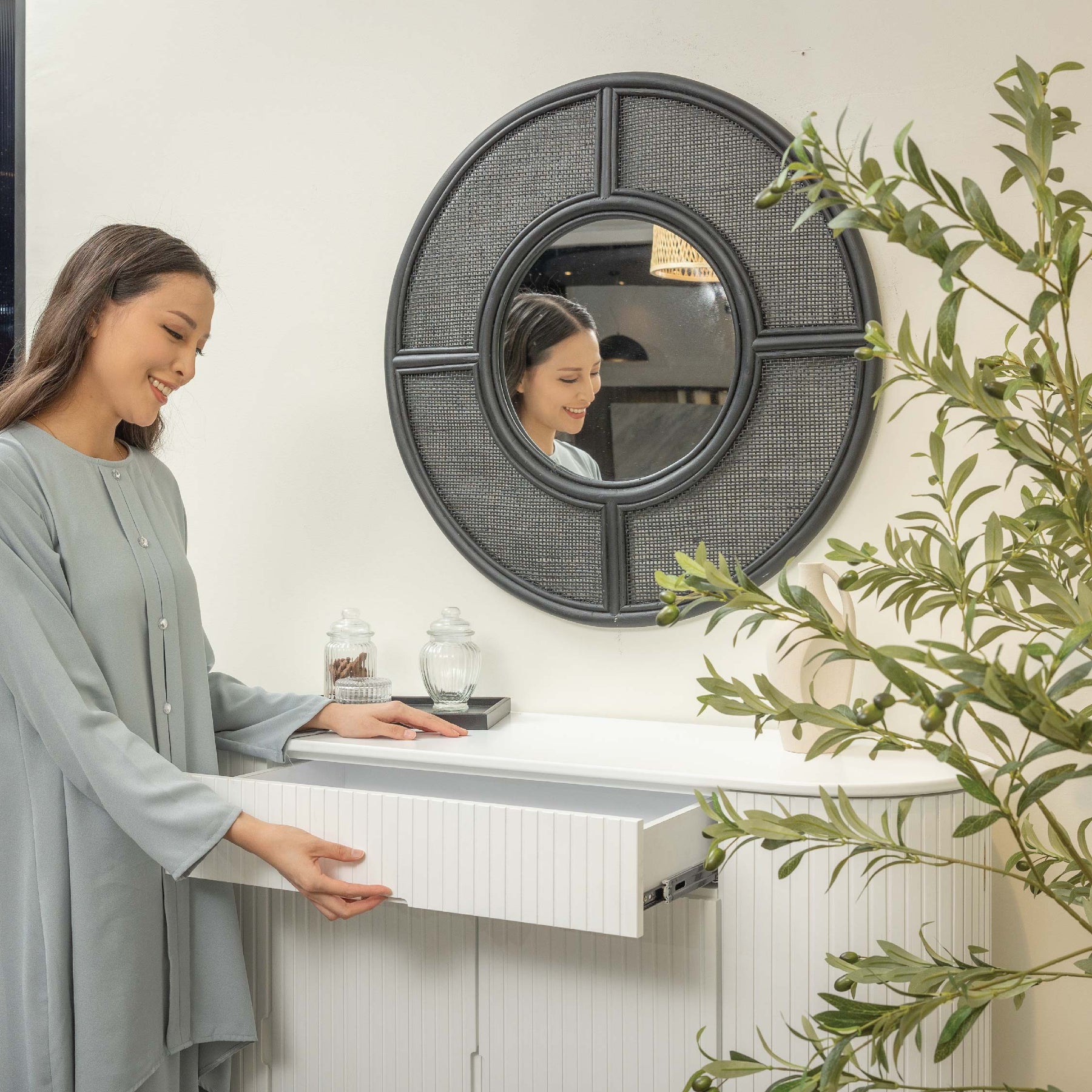 The Ava Round Mirror is a stunning and artistic piece of wall decor that seamlessly combines natural materials with a contemporary design aesthetic. Crafted with precision and an eye for detail, this mirror showcases the harmonious blend of square webbing, teak wood, natural rattan, and plywood to create a visually captivating and functional mirror.