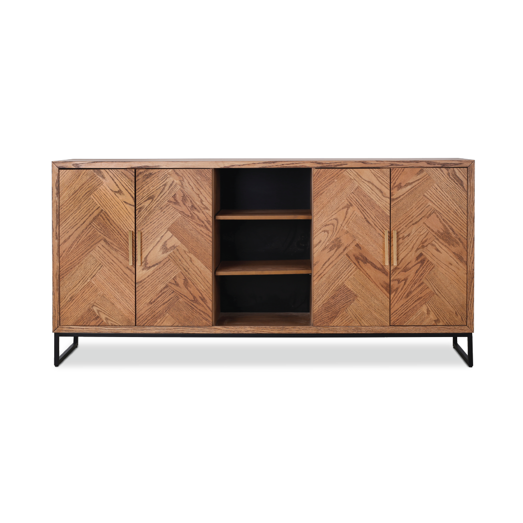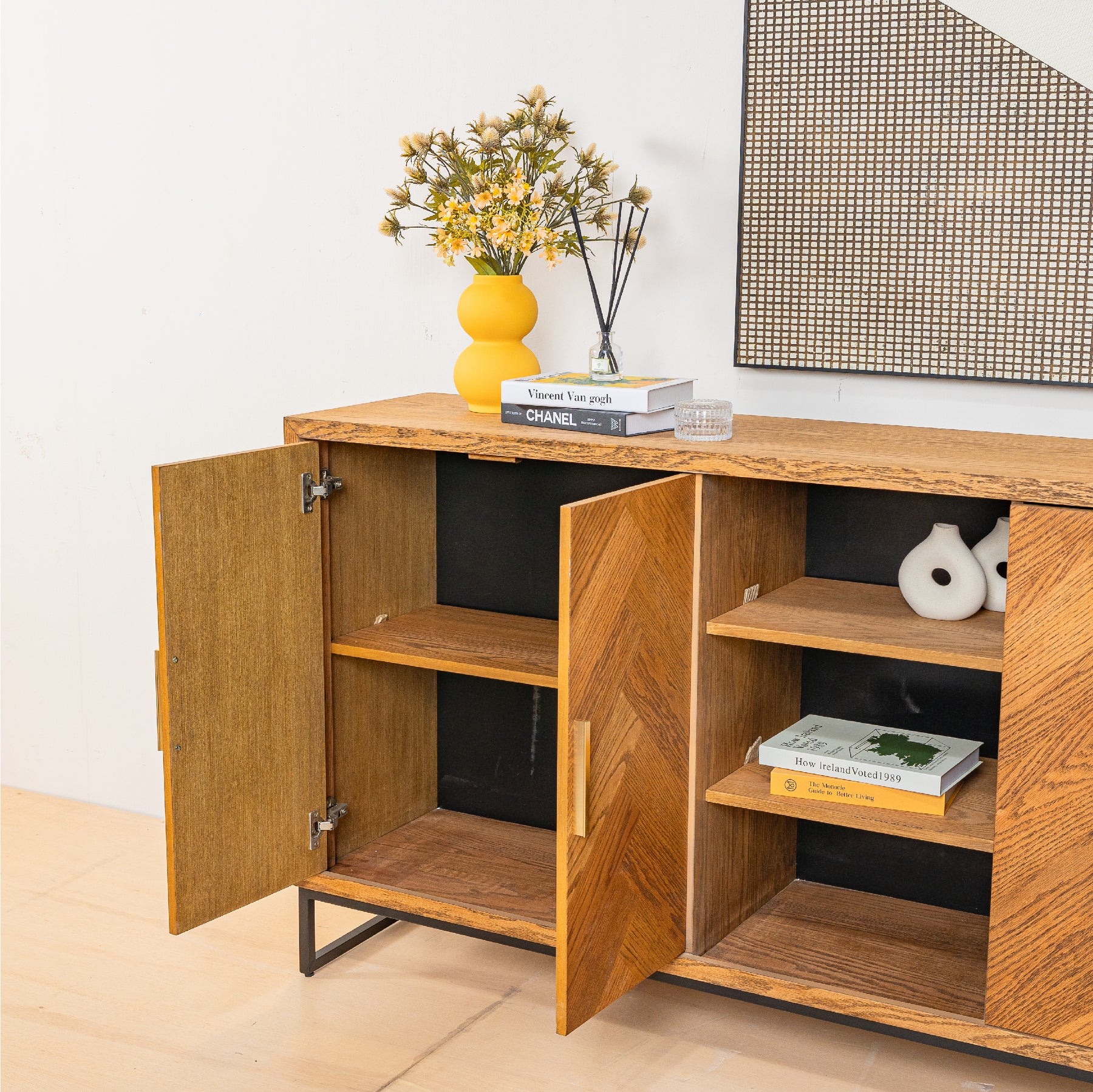 Elevate your space with the LUHUR Sideboard. Crafted from oak veneer, it features sleek black legs and hairline-finished steel handles. With four soft-closing doors and a three-tier open shelf, this sideboard seamlessly combines style and functionality. Organize with ease and showcase decor in a piece that exemplifies premium craftsmanship. Redefine your living space with the LUHUR Sideboard's sophisticated design and versatile storage solutions.