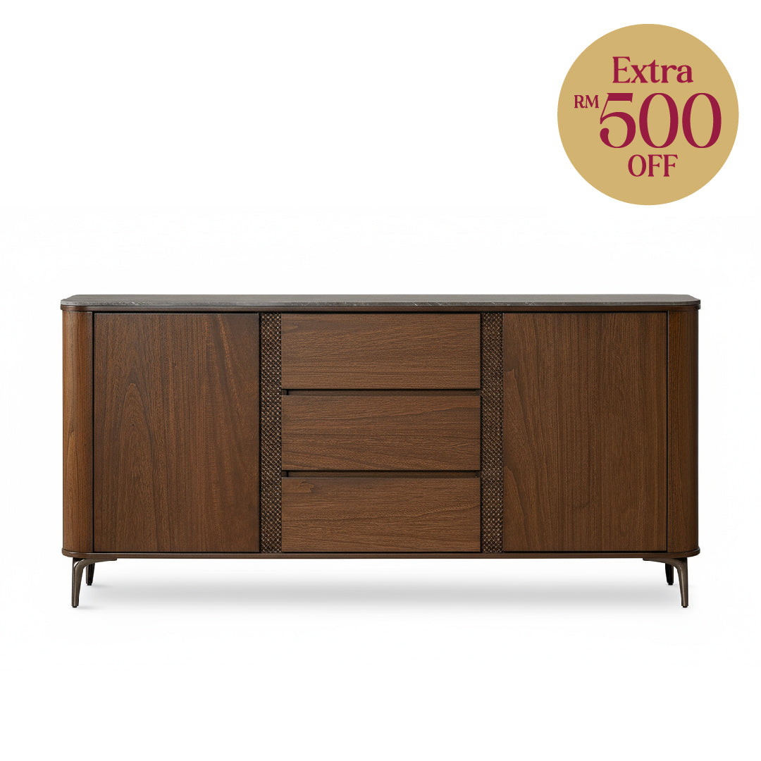 The Marley Sideboard blends modern elegance with practical storage, featuring a sleek ceramic top and a warm Mindi veneer body. Supported by solid metal legs in a titanium metallic finish, it delivers both style and stability. Designed for convenience, it includes three spacious drawers and two soft-close doors for smooth, organized storage.