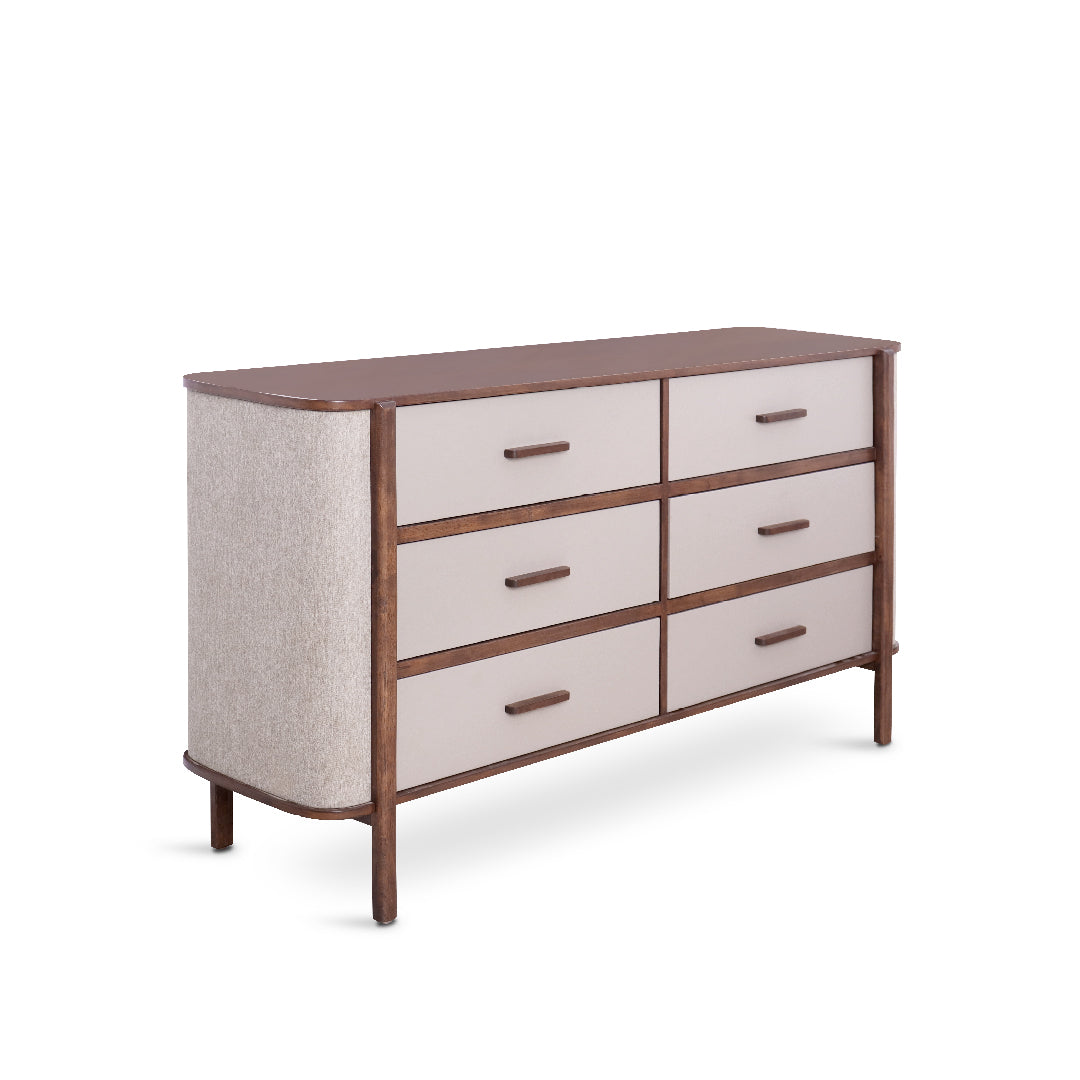 The Marra Sideboard showcases elegant craftsmanship with a rubberwood veneer body and solid rubberwood legs and handles. It features 6 soft-close drawers for smooth, quiet storage and water-repellent fabric sides that enhance both durability and style.