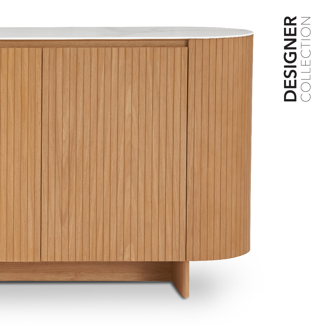 A sleek and modern storage piece combining natural warmth with contemporary elegance. Crafted with a durable 6mm sintered stone top and sturdy medium-density fibreboard, it features a warm oak finish that brings a cozy, refined touch to any space. The sideboard includes 3 doors with 2-tier shelving, offering both style and practical storage for your essentials.