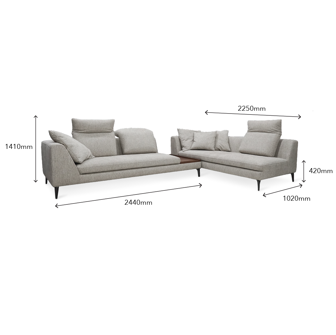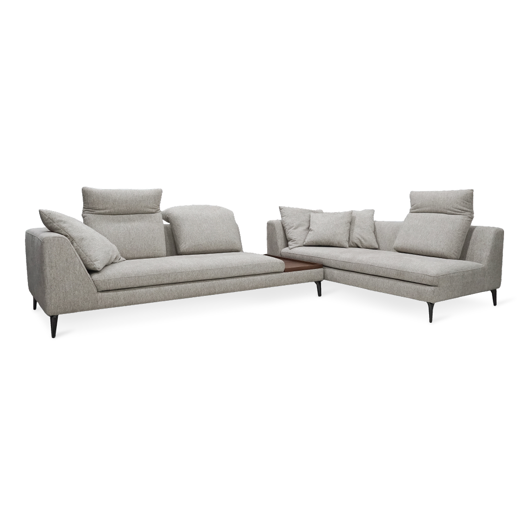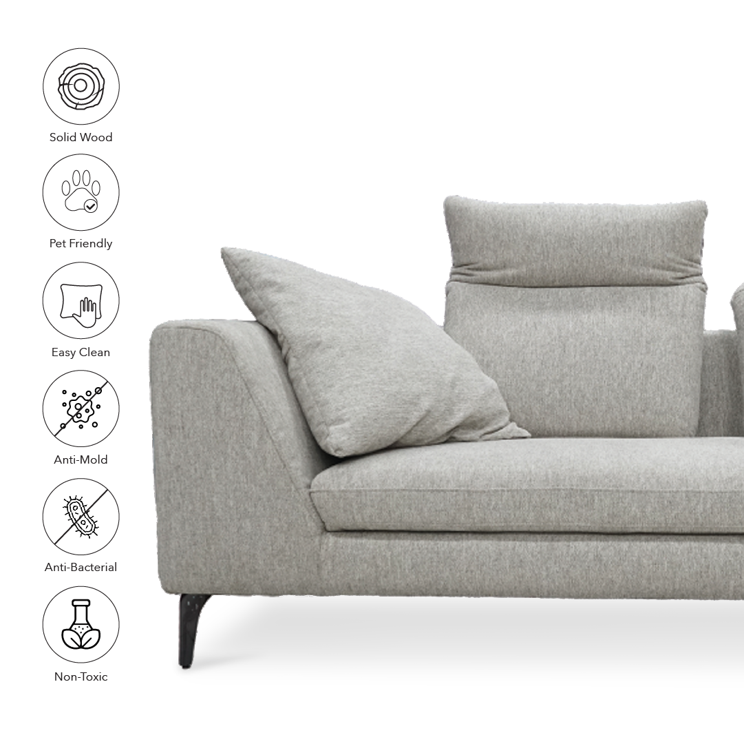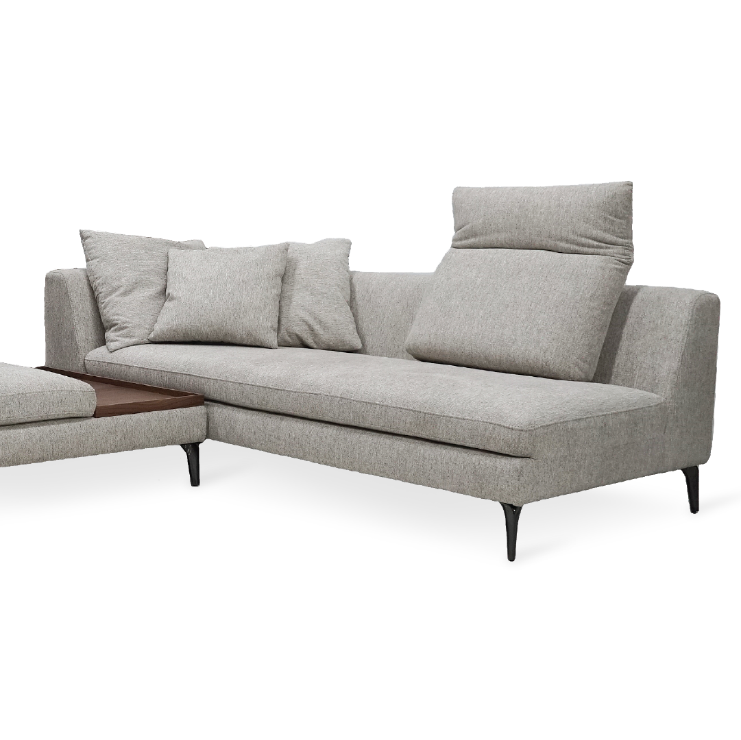 The Fettu Sofa Set is a stylish and functional sectional sofa designed to seat up to six people comfortably, with a convenient side table in the middle. Its frame combines plywood and solid Meranti wood for durability, while the seating includes high-density polyurethane foam, high resilience foam, polyester fiber, zig-zag springs, fiber gel, and elastic webbing for optimal comfort and support. The powder-coated metal legs add a modern touch, and the Stone Latte color enhances its elegant aesthetic. The sofa set features adjustable headrests for personalized comfort, making it ideal for both relaxation and everyday use.