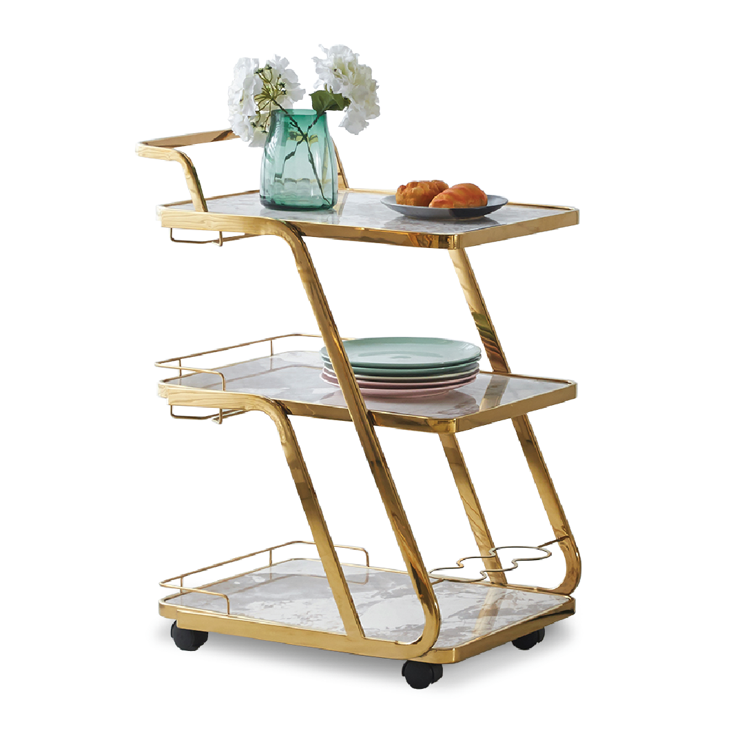 Presenting the ATHOS Trolley a stylish and useful combination. With its elegant Sintered Stone top and opulent Gold Stainless Steel frame, this three-tier masterpiece is the epitome of design and longevity. It glides smoothly and sophisticatedly into any area thanks to its smooth Castor Wheels. Enhance your experience with ATHOS, where timeless stainless steel elegance unites form and function.