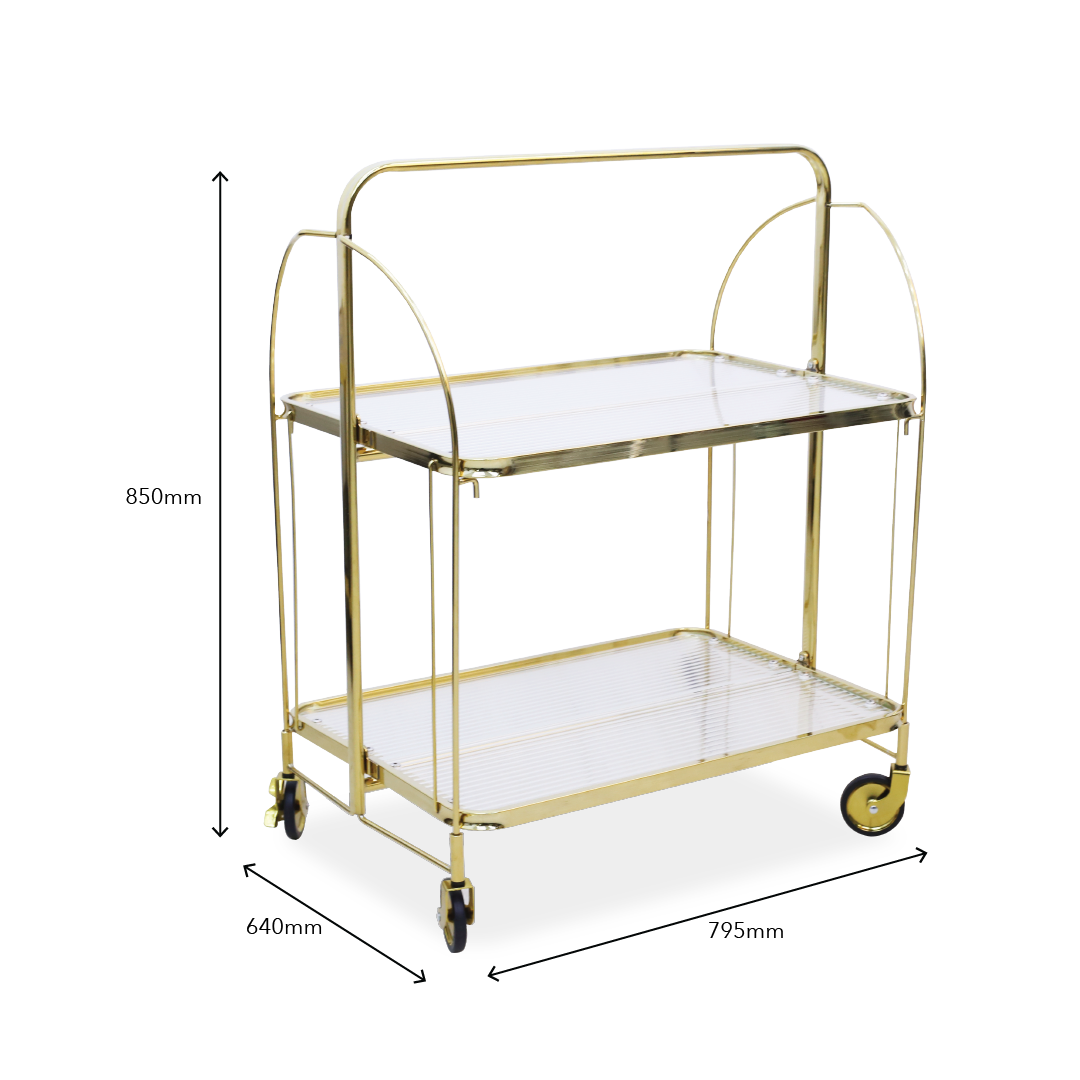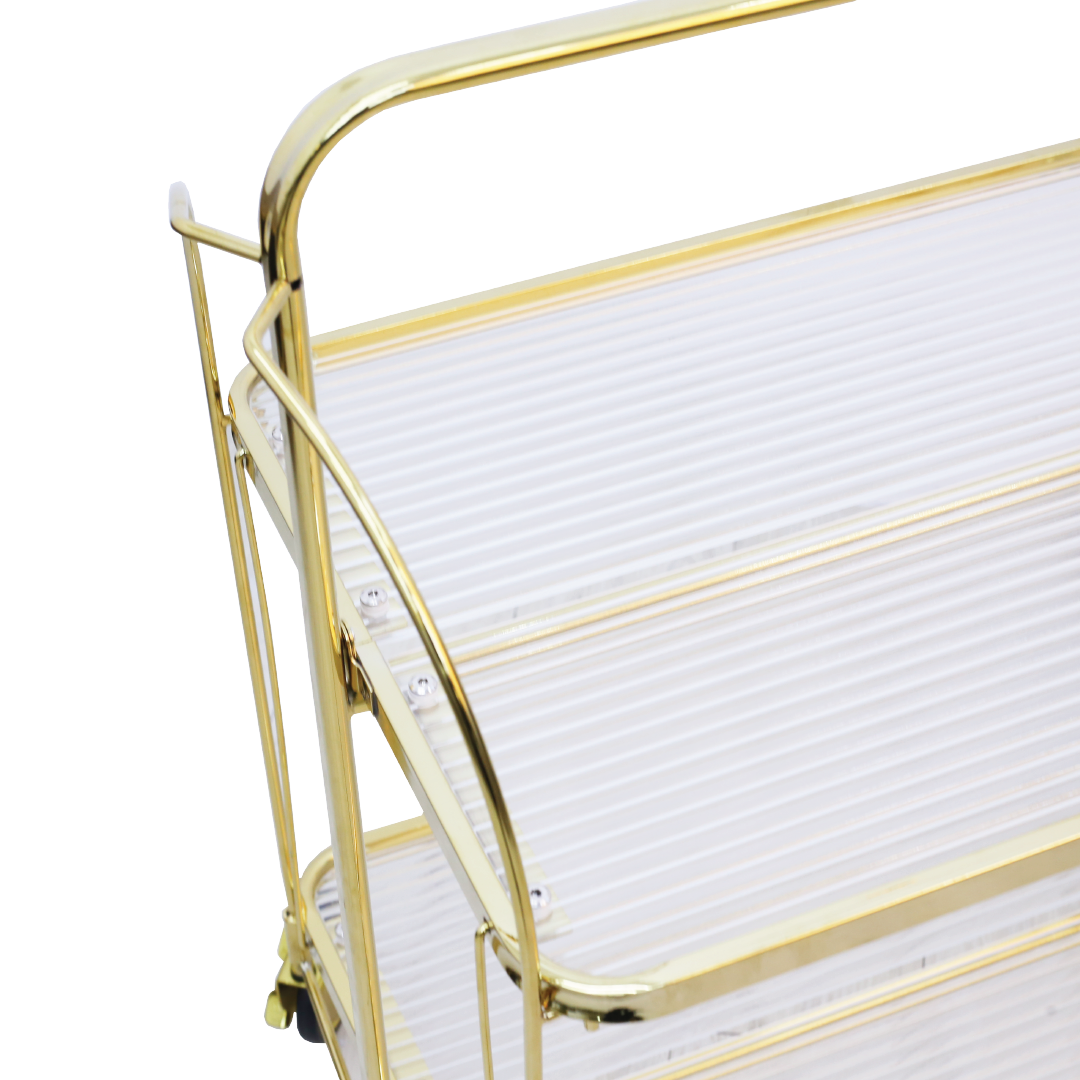 Introducing the Kepler Trolley, a sleek and functional accent piece for your home. With two tiers, this trolley provides convenient storage or display options. The top is crafted from durable Matt Fluted Tempered Glass, adding a touch of sophistication, while the frame is constructed from Chrome Gold Metal, offering both stability and a luxurious aesthetic. Elevate your home decor with the Kepler Trolley, where the combination of tempered glass and gold metal creates a stylish and practical addition to any space.