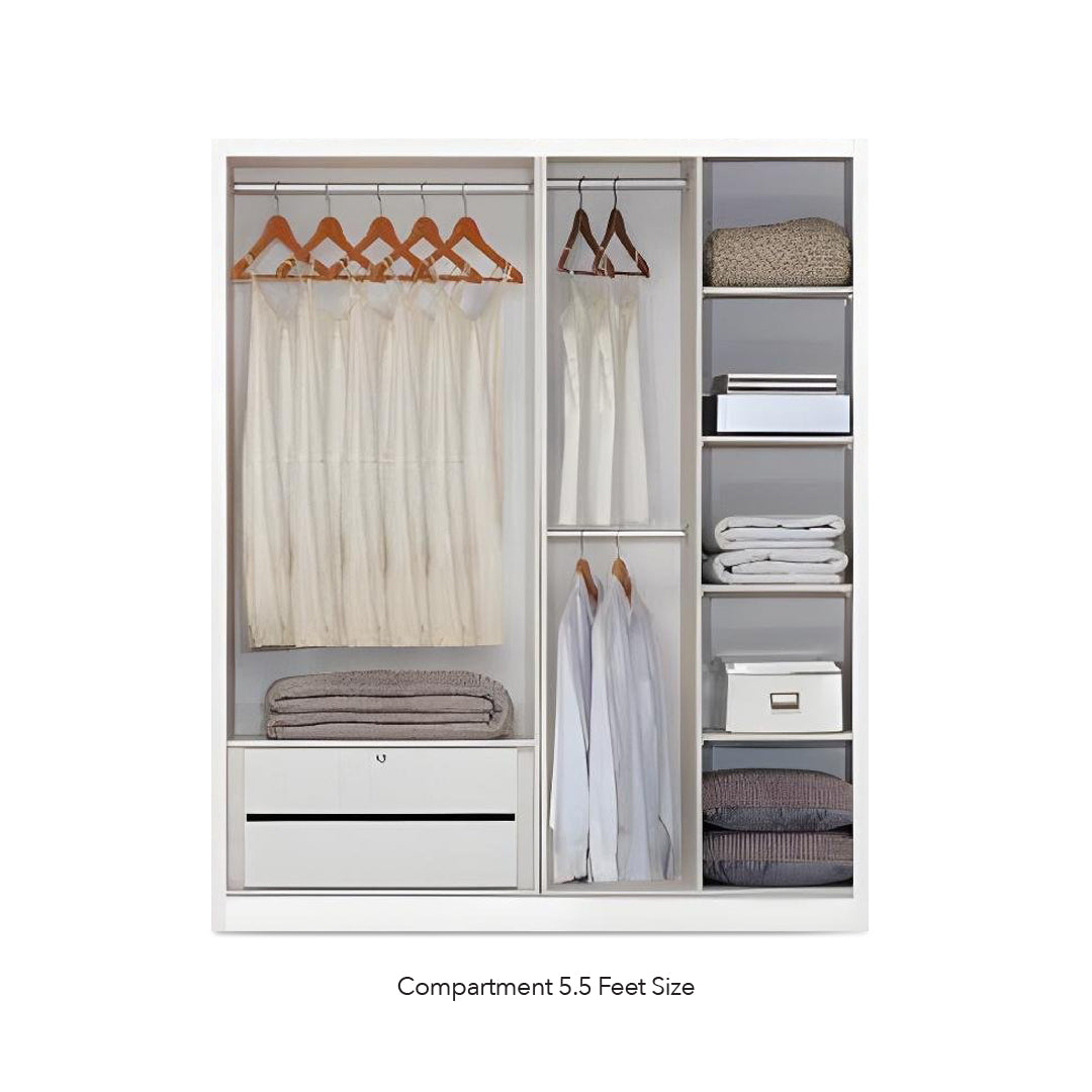 The Wren Wardrobe offers smart storage in a modern design, made from sturdy MDF and High-Density Compression Board with a smooth PU PVC hot-pressed finish. It features 3 hanging rods, 2 drawers, and 5 shelves—providing ample space to organize clothes, accessories, and essentials with ease.