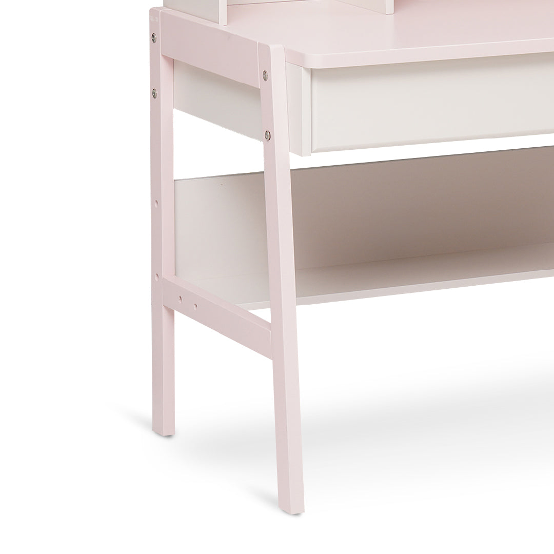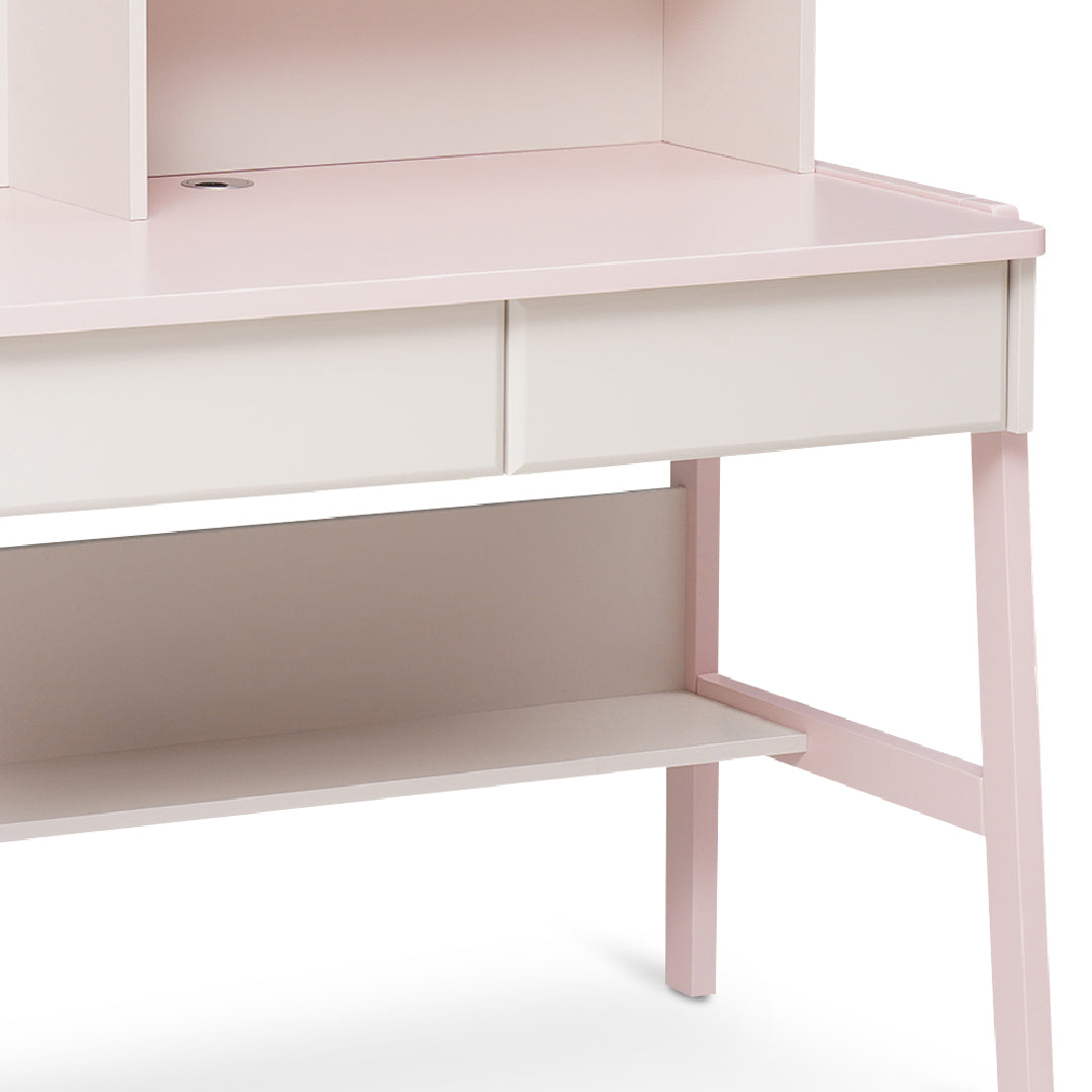 The Areka Study Desk features a soft pink and white finish crafted from durable MDF with smooth spray paint. Designed for both style and function, it includes a wire manager, three open display shelves, a lower open shelf, and one drawer for organized storage.