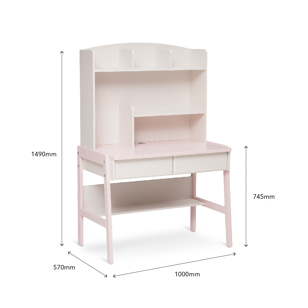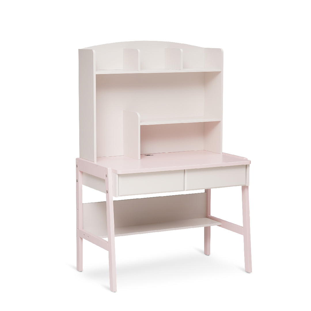The Areka Study Desk features a soft pink and white finish crafted from durable MDF with smooth spray paint. Designed for both style and function, it includes a wire manager, three open display shelves, a lower open shelf, and one drawer for organized storage.