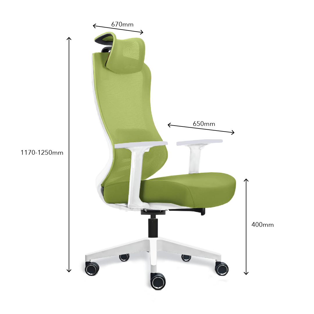 Enjoy exceptional comfort and design when you use the ELITE High Back Chair Apple Green. Its high-density foam, Class 4 gas lift, and FP high base are all designed to provide the best possible support. It is the ideal alternative for a contemporary and ergonomic workstation because of its intelligent synchronized mechanism, 3D adjustable armrest and headrest, and choices of Dark Grey or Apple Green colors.