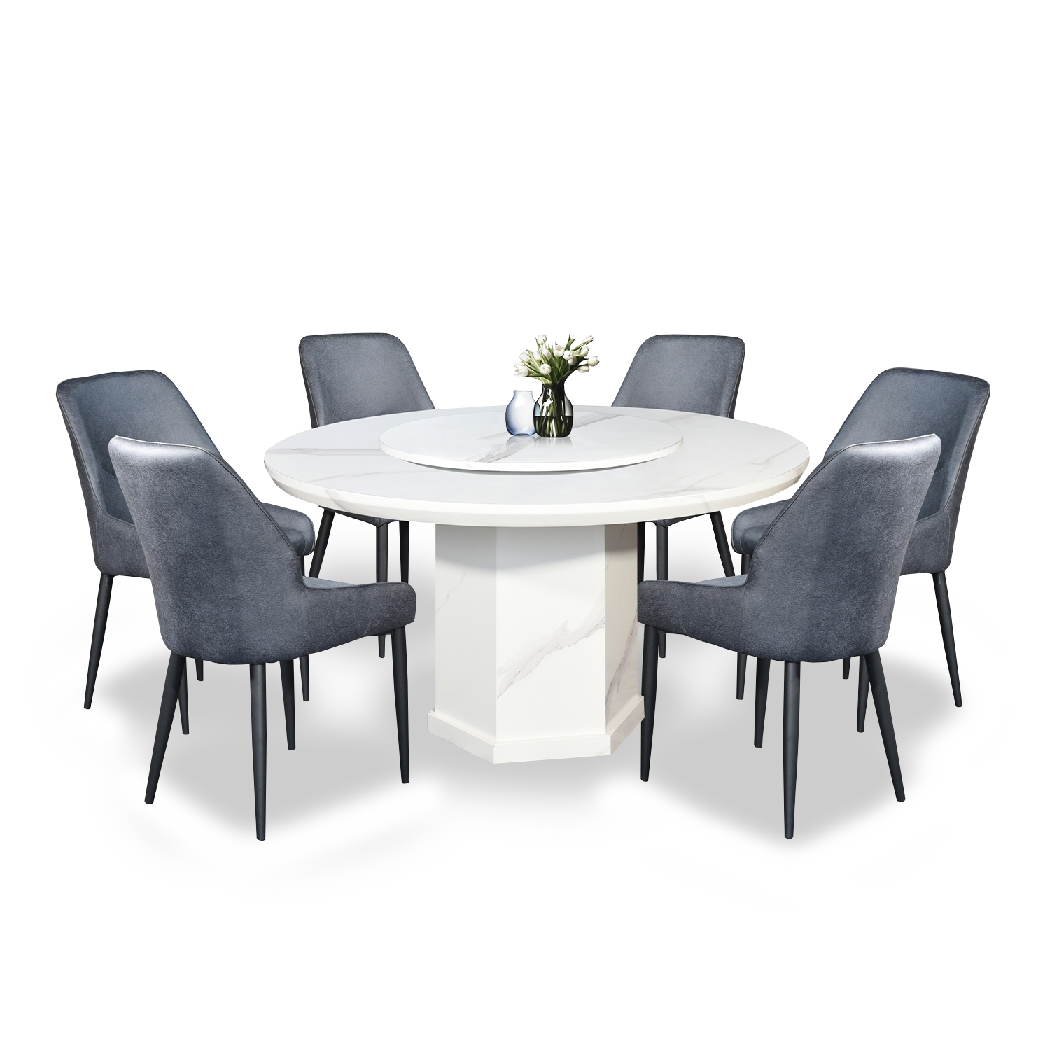 The Pasaje Marble Dining Table is a stunning blend of luxury and functionality, designed to elevate any dining space. Featuring a laminated marble top, this table offers a sleek and polished surface that exudes sophistication. The marble legs provide a sturdy and cohesive look, enhancing the table's overall elegance. Adding to its practicality, the table includes a built-in lazy susan, making it easy to share dishes during meals. This combination of beauty and convenience makes the Pasaje Marble Dining Table a perfect centerpiece for modern dining rooms.