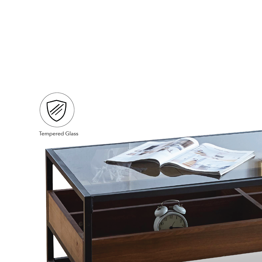 Using the KARE Coffee Table, a tasteful fusion of style and utility. Its sleek design, which was meticulously crafted, has a smokey black tempered glass top that is matched by a walnut veneer body and metal powder-coated legs. The table elegantly blends design and functionality with its four open sections for easy storage. The KARE Coffee Table will elevate your living area since it combines modern elegance with adaptable functionality.